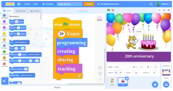Scratch dates back to 2003 (Figure 1), and the previous 20 years have made it one of the most popular programming languages in the educational world [31]. In turn, this technology can be a powerful tool for integrating art (A) and creativity in schools [32] by developing skills in STEAM disciplines [33]. In addition, students can explore and learn important skills such as algorithmic and critical thinking [34,35] in a fun way through the creation of projects, making it not only a one-to-one programme, but also a diverse and welcoming online community [36] that generates motivation [37,38,39,40] and sparks interest even in the scientific field of neuroeducation [41].