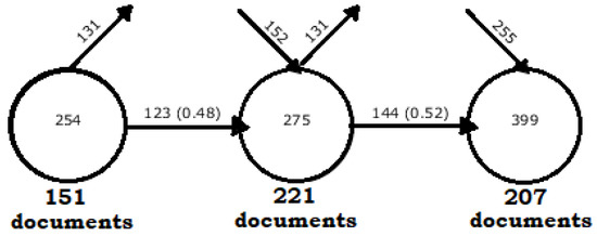 To reveal the results of the evolution of Scratch keywords, Figure 7 shows the development of the three periods analysed. In this picture you can see the relevant data for analysis. In the first circle on the left, corresponding to the first period (P1) 2003–2016, which contained 151 documents, 254 keywords appeared, of which 123 (48%) are repeated in the second period, with a total of 131 disappearing as indicated by the ascending arrow above the first circle. Then, in the second circle corresponding to the period (P2) 2017–2019 with 221 documents, it can be seen how the number of keywords increased by 275, of which 152 new ones appeared in reference to the first period studied. Finally, in the third circle, which refers to the third period (P3) 2020–2022 with 207 documents, the number of keywords increased to 399, of which 144 keywords from the second period were retained. In addition, 255 new keywords were included in the last three years. The fact that 48% of the keywords were retained from the first to the second period and 52% from the second to the third period indicates that the research has been undergoing new lines of research in the process of stabilisation.