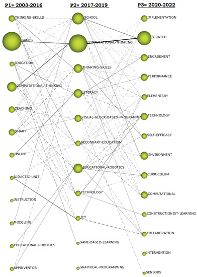 To identify the most prominent themes and keywords of the analysed Scratch-EDU manuscripts during the three periods, a map was generated using the Jaccard’s Index [117]. In Figure 8, the relationship between the different time periods can be seen in three columns, making connections of the themes and keywords. If the thematic linkage is represented with a continuous line, it means a thematic and therefore conceptual relationship; however, if the line is dashed, it means that the connection is term- and keyword-based and, therefore, not conceptual. Another aspect to take into account in this figure is the thickness of the line; the thicker the line, the greater the number of relationships. If we analyse this figure we can see that in the first period the terms “Computational Thinking and “Games” were linked to “Computational Thinking” in the second period and, in turn, to “Scratch” in the third period in a very notable and outstanding way in the scientific literature.