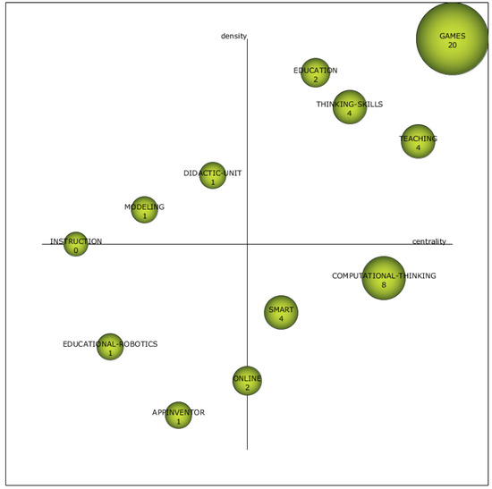 Looking at the analysis of the first period (2003–2016) with a total of 151 documents analysed, we can observe (Figure 10 and Table 3) that the term “Games” is located in the Q1 quadrant as a driving term, together with “Education”, “Teaching” and “Thinking Skills”. In addition, the author highlights the term “Computational Thinking” in quadrant Q4 as a core or cross-cutting theme related to Scratch. Figure 11b shows the cluster “Games” with the highest number of documents, which in turn is related to terms such as “Scratch”, “Programming”, “Learning”, “Curriculum” or “Primary Education”. Table 3 shows the distribution of the terms in the different quadrants, as well as the value of the different indices studied together with the sum of citations.