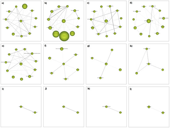 Information on the cluster network of the 1st period (2003–2016). Strategic diagram (h-index) and performance from 2003 to 2016. Themes include (a) “Thinking-Skills”, (b) “Games”, (c) “Education”, (d) “Computational-Thinking”, (e) “Teaching”, (f) “Smart”, (g) “Online”, (h) “Didactic-Unit”, (i) “Instruction”, (j) “Modelling”, (k) “Educational-Robotics” and (l) “APPInventor”.