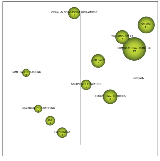 During P = 2, the topic with the highest bibliometric index was “Computational Thinking” with a large difference over the rest, located in quadrant Q1 with other terms such as “School”, Thinking Skills” and “Literacy”. In relation to the basic and cross-cutting themes, “Educational Robotics” and “Secondary School” are shown (Figure 12). In the cluster term analysis (Figure 13a) it can be seen how Scratch research is mainly related to “School” and associated with terms such as “Makerspaces”, “Coding” or “Teaching”. Another term with a large bibliometric contribution in this second period was “Computational Thinking”, associating Scratch with terms such as “Programming”, “Education”, “Learning” or “Problem Solving” (Figure 11b). Table 4 shows the distribution of the terms in the different quadrants, as well as the value of the different indices studied together with the sum of citations. In the STEM domain, the technology domain in Figure 13h is related to terms such as creativity, abstraction, interdisciplinarity or mathematics.
