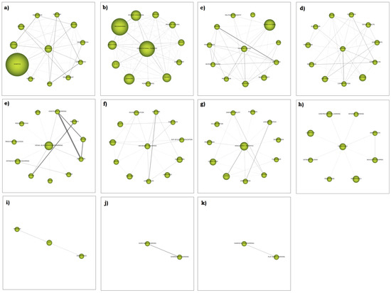 The data presented below show a variety of information of great significance for the study. On the one hand, a strategic diagram is provided to define the value of the themes that have resulted from the study of the co-word analysis in the various time periods P1, P2 and P3. In particular, Callon’s analysis [118] was used, which produces a clustering of topics and keywords depending on the centrality (strength of the relationship between external links) and density (strength of the relationship between internal links). The bibliometric indicators provide insight into the value of the various research fields, such as the h-Index, g-Index, hg-Index and q2-Index. Finally, a cluster network with the most outstanding words in the different time intervals is shown.