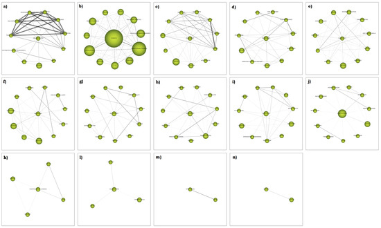 Information on the cluster network of the 3rd period (2020–2022). Strategic diagram (h-index) and performance from 2017 to 2019. Themes include (a) “Implementation”, (b) “Scratch” (c) “Engagement”, (d) “Performance”, (e) “Elementary”, (f) “Technology”, (g) “Self-Efficacy”, (h) “Environment”, (i) “Curriculum”, (j) “Computational”, (k) “Constructionist-Learning”, (l) “Collaboration”, (m) “Intervention” and (n) Sensors”.