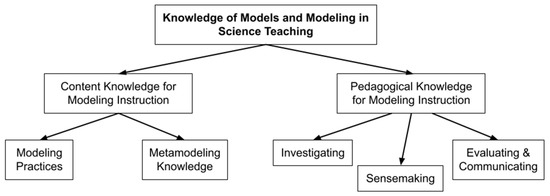 Shulman’s [24] seminal work in PCK frames CK and PK as the knowledge domains that teachers must enact together to make science content understandable for students. In the context of modeling, CK is knowledge about how models and modeling function in science, for which there is a wealth of literature that has focused on the identification of this construct [30,31,33,34] as well as ways to measure and assess this construct [35,36]. Since modeling was identified as one of the eight science and engineering practices by the NGSS, much of the research has focused on students, aiming to identify what students should learn about models/modeling and how the uptake of this knowledge occurs. By viewing teachers as adult learners who must possess the CK that they expect their students to learn, we can use the research on students’ CK of models/modeling to build the construct of CK. Regarding what students should learn, many researchers agree that students should have knowledge of modeling practices [30,31,36]. This refers to the iterative process of modeling, which includes phases of model construction, model testing or evaluation, and model revision and is often referred to as the conceptual understanding of modeling [37].