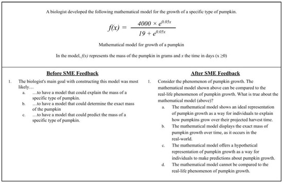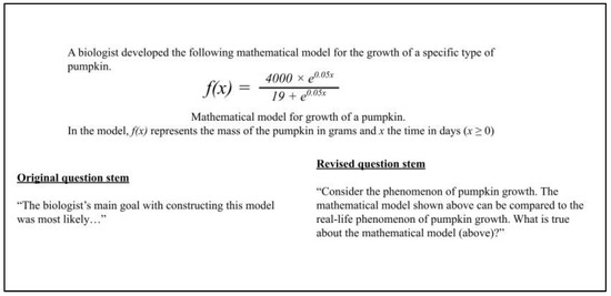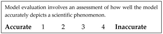 Using the revised KMM-ST framework shown in Figure 4, focusing only on the CK portion of the framework, CK items were written to reflect the five components of the CK subconstruct as well as the levels defined in the FMC. All items were written as multiple-choice items. Item specifications included: (1) background information which would contextualize the model for the participant, (2) a question stem that was aligned with one of the five components in the FMC, and (3) answer options which corresponded to each level in the FMC for that modeling component. Background information for each question was constructed through the modification of eight models provided in a pre-existing German multiple-choice instrument to assess pre-service science teachers’ scientific reasoning competences [52], translated into English [53,54]. Modifications were made to the eight models to improve their clarity (i.e., recreate figures and graphs) and to add additional background information necessary for contextualizing the model. An example item showing the three parts (background, question stem, and answer options) is shown in Figure 6. Each of the five components in the FMC was assessed with five items each for a total of 25 items in the 2nd version of the survey.