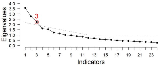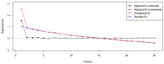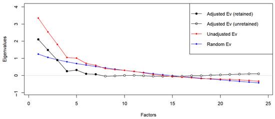 We conducted a test to determine the suitability of the data for exploratory factor analysis (EFA). The Kaiser–Meyer–Olkin (KMO) Measure of Sampling Adequacy and Bartlett’s Test of Sphericity can be used for this purpose [47]. Bartlett’s Test of Sphericity (𝝌2 = 753.55; d.f. = 276; p < 0.001) and the KMO Measure of Sampling Adequacy (KMO = 0.663) indicate that EFA was appropriate for our sample. Factor analysis (Principal Axis Factoring) of the dataset using Oblimin rotation revealed a four-factor model based on eigenvalues which were greater than one (i.e., Kaiser’s criterion [49]). It should be noted that there was no clear drop in eigenvalues below one, which indicated the need for alternative methods for clarifying the factors in the scale. We used Horn’s parallel analysis [50] to further examine the scale. The analysis revealed a seven-factor model would be more suitable for the data (Figure 7). Using Horn’s method for parallel analysis [50], a random set of data was generated over 720 iterations to produce eigenvalue distributions at the 95th percentile. In Figure 7, the red line shows the observed data, the black line shows the 95th percentile (adjusted data), and the blue line shows the randomly generated data. Again, there is a lack of clarity regarding the number of factors to retain, as the graph shows seven factors to be retained, yet factors from three to seven fell below the blue line. Upon seeing this result, we adopted a third method for exploring the number of factors to be retained: the empirical Kaiser criterion method [51]. This method “clearly outperforms parallel analysis for the specific case of oblique factors” [51] (p. 463). Figure 8 shows the findings from the empirical Kaiser criterion method, which indicated three factors be retained.