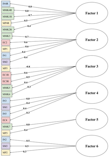 Six-factor model for the 1st version of the KMM-ST survey. Color indicates theoretically-assigned category.