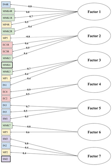 Next, we extracted the seven-factor model using Principal Axis Factoring and Oblimin rotation. The seven factors explained a total variance of 49%, an improvement of 5% from the six-factor model. As Figure 10 shows, 22 of the 24 variables loaded onto the seven factors, and the factor loadings ranged from 0.4 to 0.9, a slight improvement from the 0.3 to 0.8 range in the six-factor model. Item MP5 was still a problematic item with a negative factor loading (−0.8 on Factor 2). More detailed factor loadings can be found in Supplementary File S3, and the correlation matrix for this survey can be found in Supplementary File S4. Again, this factor structure does not coincide with the theoretical framework on which the items were developed. As Figure 10 shows, the items continue to load based on factors that we did not anticipate (i.e., colors are not matched to factors). Reverse-coded items are loading onto factors by themselves (e.g., Factor 1), and CK items (e.g., MP and MMK items) are loading onto factors with PK items (e.g., IN, SM, and EC items). Furthermore, two items, MMK6 and SM2, did not load onto any of the seven factors because they had cross-loadings across two or more factors (see Supplementary File S3).