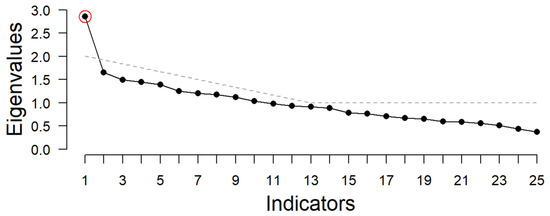We conducted a test to determine the suitability of the data for exploratory factor analysis (EFA). The Kaiser–Meyer–Olkin (KMO) Measure of Sampling Adequacy and Bartlett’s Test of Sphericity can be used for this purpose [47]. Bartlett’s Test of Sphericity (𝝌2 = 488.09; d.f. = 300; p < 0.001) and the KMO Measure of Sampling Adequacy (KMO = 0.600) indicate that EFA was appropriate for our sample. Factor analysis (Principal Axis Factoring) of the dataset using Oblimin rotation revealed a one-factor model based on eigenvalues which were greater than one (i.e., Kaiser’s criterion [49]). We used Horn’s parallel analysis [50] to further examine the scale. This analysis revealed a five-factor model would be more suitable for the data (Figure 13). Using Horn’s method for parallel analysis [50], a random set of data was generated over 720 iterations to produce eigenvalue distributions at the 95th percentile. In Figure 13, the red line shows the observed data, the black line shows the 95th percentile (adjusted data), and the blue line shows the randomly generated data. A one-factor model is consistent with the revised KMM-ST framework (Figure 3), where all five components tested in this survey belong to the CK subconstruct. A five-factor model would also be supported by the literature if it aligns with the five components identified in the FMC (Table 1). Given the discrepancy between Kaiser’s criterion and Horn’s parallel analysis, we adopted a third method for determining factor retention: the empirical Kaiser criterion method [51]. This method suggested a one-factor model was most appropriate for the data (Figure 14).