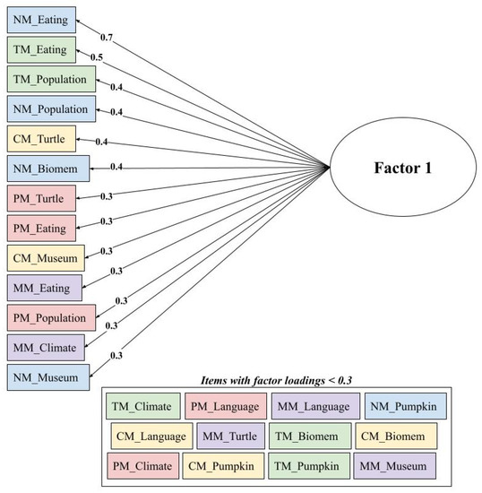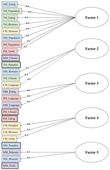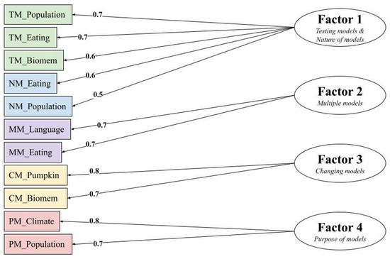 Unlike the items from the first version of the KMM-ST survey, the second KMM-ST survey showed potential for alignment with the theoretical framework. Therefore, we moved into a period of iterative item reduction in hopes of clarifying the factor structure. We used the one-factor model to guide this work because it was supported by the empirical Kaiser criterion [51] and general Kaiser’s rule [49] as the appropriate factor structure for the data. Using guidance from Ford et al. [57], we took a stepwise approach to item reduction in which we dropped items with communalities less than 0.20 and factor loadings less than 0.40. We dropped one item at a time, choosing items with the lowest communality value and factor loading each time, and reexamined the factor structure after each item was dropped. A total of 14 items were dropped from the scale before a factor structure resembling the FMC was revealed. This factor structure was found to be a four-factor model (RMSEA = 0; TLI = 1.06; and BIC = −70), in which testing models and nature of models fall into the same factor while the other components of the FMC (changing models, purpose of models, and multiple models) are in their own factors. Dropping over 50% of the total items is not ideal, and we do not suggest the final scale is a valid and reliable scale for measuring KMM-ST given the measures taken to clarify the factor structure. However, it does show promise for the next round of revision of the KMM-ST survey as it helps to show patterns in the items that belong to the same factor. Figure 17 shows the factor structure, while Table 6 shows the factor loadings and communalities for the retained items. More detailed information can be found in Supplementary File S5.