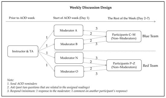 Figure 2 presents how each AOD was implemented per week. Two students in each team were selected to be moderators. The moderator role would be rotated weekly inside the team to make sure that each student had an equal chance of achieving the experience of facilitating the discussion. Each student was notified of their assigned two weeks for playing the moderator at the beginning of the semester. The moderators had to review the learning resources and prepare facilitated questions as two discussion prompts in two postings when each week started. There was no guidance or rubric introducing which type of facilitating questions should be posed because the instructor intended to motivate students to draft the questions by using their own mindset instead of any existing frameworks. The moderators were also allowed to use their own way to facilitate the discussions since no instruction was provided to pre-define the facilitating strategies. Students who were not moderators (i.e., participants) were required to respond to at least one post from a moderator (i.e., facilitated question) and one from a classmate during the week.