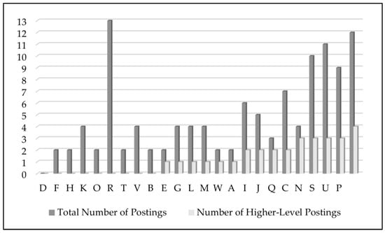 Figure 5 shows the chronological visuals analyzing students’ patterns of interaction in the AOD. When the researchers of this study examined the interactions that occurred in the chronological visuals, they counted the number of different interaction indicators suggested by []. Andrew coined how analyzing an AOD should depend on five interaction indicators: (1) the number of single postings, (2) the percentage of students participating in the AOD beyond the minimum required number of postings, (3) the number of developed threads, (4) the number of participant–participant conversations, and (5) the number of participant-moderator/instructor conversations [,]. According to the chronological visuals, 116 postings were created by moderators and participants, and 65% of students actively created postings in the AOD beyond the minimum required number of postings. The two indicators suggest that students’ active participation provided a good foundation for meaningful interactions in the AOD. When the other three indicators with the chronological visuals were reviewed, interactive patterns appeared.