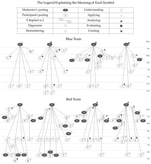 Yet, the design of the AOD did not fit the rest of the cooperative learning requirements. Although the students were assigned to two discussion teams (i.e., the blue and red teams), the size of a single discussion team did not meet even the most flexible group size requirement (i.e., less than seven) of the cooperative learning theory []. Moreover, the students did not share common goals in the AODs. They were required to participate in the AODs by posting responses, but there was no evidence proving they had to create one or more common visible products through the AODs. Postings could be regarded as visual products reluctantly, but a posting could be finished by an individual without cooperation. Thus, creating postings could not be a common goal shared by all the students from the same group.
