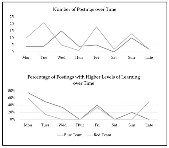 Intermittent. Chronological visuals demonstrated students’ interactions and their cognitive learning in a time frame. Figure 6 shows how the number of postings and the percentage of postings with higher levels of learning in each team of the AOD changed over time. Regarding interactions, the two teams performed similarly, with minor discrepancies in the timeline. For both teams, the peak of interaction occurred in the early stage of the AOD (i.e., Monday and Wednesday), as the red team created 21 postings and the blue team created 15 postings on Wednesday. In the middle stage of the AOD (i.e., Thursday), students’ interaction in both teams dropped dramatically. On Friday, the interaction rebounded slightly in the blue team and largely in the red team. Saturday was an expectable valley of interaction as the AOD proceeded to the weekends. However, both teams posted a decent number of postings on the last day (i.e., 13 postings from the red team and 10 postings from the blue team), which could be suspected of cramming behavior. The interaction changed over the week and implied that even though the AOD provided students with a very flexible schedule, most interactions happened intensively in a few narrow time ranges. Zooming in on the change in interaction quality, the researchers further found that the tendencies of the two teams’ cognitive development almost overlapped and were consistent with the tendencies of their interactive development. For instance, on Monday, for both groups, the number of postings with higher levels of learning took up more than 50 percent of the total number of postings. Another two peaks occurred in the middle and the end of the week (i.e., Friday and Sunday/Late). It proved that both interaction and cognitive development were not continuous but intermittent in the AOD.