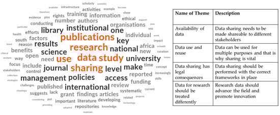 The most salient ideas were summarised from each of the literature sources and coded according to their themes. The thematic coding of ideas was performed within the scoping process and noted on a separate data source. The thematic coding was conducted on the premise of the most salient ideas surrounding data sharing, governance, and the challenges associated with them. The analysis was only performed on the final data included in the scoping review. An initial analysis was performed to identify the broad overarching categories, which were then subdivided to understand the nuance and gain further context for the subject matter. Each of the broadly defined categories underwent another thematic analysis to extract the themes within each of them. This meant that the analysis process occurred on two different levels of understanding for the texts: (a) a superficial categorisation of the broader themes from within the literature, and (b) a more descriptive and nuanced analysis of the text to understand the scope and context of the categories. The information was then further prepared for analysis using Python 3.7 for the data processing of the frequency graphs and the visualisation of the codified data. These visualisations included word clouds to illustrate the most salient synonyms and related words within the body of knowledge that were grouped into the respective themes. Furthermore, the information was processed to include additional descriptive data such as word frequencies and frequency graphs and tables. These datapoints were then grouped to include the primary overarching ideas related to data sharing in this context for further discussion. The summary of these results is outlined within the results section below.