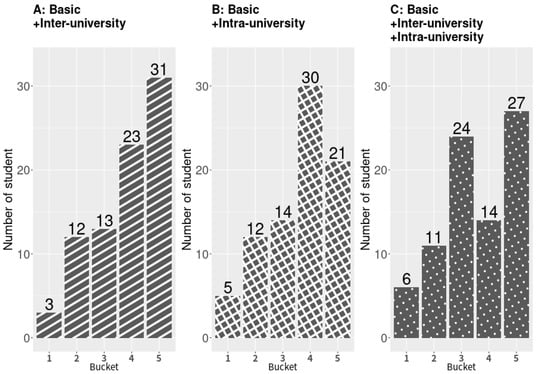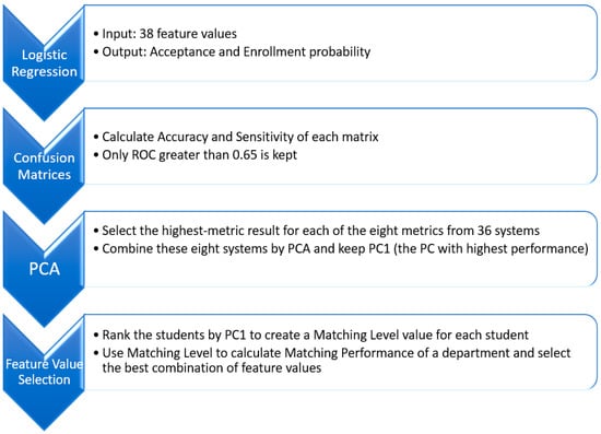 Differences in explanatory power between feature values were not evident. However, department-specific values were likely to be more heavily weighted because departments differed in their admission criteria and preferences. Moreover, the weight of specific values may change every year. Thus, our goal was not to identify the feature values with the highest weight; instead, we aimed to design a process that worked for all departments. We achieved this goal by combining the basic feature values along with either interuniversity or intrauniversity values, or both, to determine the most optimal one for every department, and then select the one with the best performance; the definition of best performance is discussed in Section 3. We planned to explore disparate combinations of feature values in future studies. However, this study used the following three combinations of feature values in our logistic regression model: (A) basic and interuniversity; (B) basic and intrauniversity; and (C) basic, interuniversity, and intrauniversity.