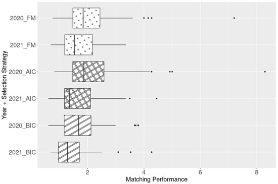 The combination with the highest MP was then selected as the best-performing model, which was combination A of this example department. We then analyzed the 2021 enrollment data with combination A to compare the results with those of 2020. Figure 3 illustrates the box plot of the MP values from 34 departments; each box goes from the first quartile to the third quartile; the middle line represents the median. The two upper boxes represent the current model applied to the data from 2020 and 2021, which we call the full model (FM); the middle and the bottom ones represent the following two other indicators used to select feature values, namely the Akaike information criterion (AIC) and Bayesian information criterion (BIC), respectively. The average MP values of the 2020 data were all well above one because we used 2020 data as the criteria data. The data from 2021 had a slighter decline in MP values, but the averages all remained above one. Several outliers were present on the right of the plot, which indicated the ML was relatively high; no outliers were present on the left of the plot.