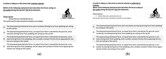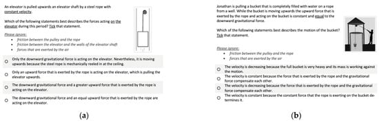 Figure 2. Comparison of items differing in the direction of problem; (a) motion → force (1mf09; based on [43,44]), (b) force → motion (1fm09; [44]).