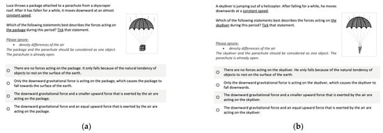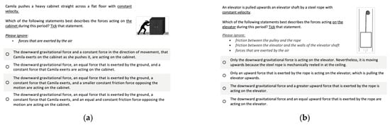 Figure 1. Comparison of items differing in the law addressed; (a) 1st law (item code: 1mf08, see Figure 6 for an explanation of item codes; context similar to [48]), (b) 2nd law (2mf08).