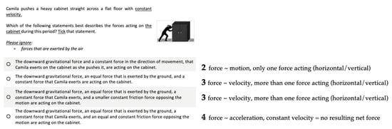 Wherever possible, items from existing instruments were employed that assessed students’ understanding of Newtonian mechanics. These items were modified according to the construction principles outlined below for our purposes. In addition, new items were developed to complement the existing item pool. To investigate the effect of the CCTCs in a controlled and systematic way, all items were constructed in a standardized way. The items were designed in accordance with guidelines for multiple-choice items (e.g., [55,56]). Each item begins with a presentation of the situation (everyday situation, one-dimensional) which is accompanied by an image and, if applicable, a statement regarding the boundary conditions (e.g., the instruction to ignore effects of air resistance or friction; see Figure 1, Figure 2, Figure 3 and Figure 4 for examples). The items consist of four answer options from which one must be ticked by the students. Items asked students to tick the “best” answer to engage students to think about the different answer options and to only tick one (e.g., [21,56]). It was ensured that responses to an item are similar in language and length to avoid other factors affecting the choice of a response. For the development of a polytomous response structure in which each response represents a different level of understanding, an ordered multiple-choice (OMC; [29]) format was used. OMC items provide more detailed information about SCs than normal multiple-choice items and at the same time maintain their advantages regarding efficiency [29] (p. 33). LPs can be used for the construction of OMC items by linking every response to a specific level of sophistication (e.g., [16]; see Figure 5 for an example). For the construction of the answer options, the four levels of understanding were employed that were described in the FMLP established by Alonzo and Steedle [16] and further unpacked by Alonzo and von Aufschnaiter [6]. Usually, each item provides answer options corresponding to all four levels of the FMLP. There are, however, some exceptions, as some items did not allow for a plausible answer option on the lowest level of understanding, while others could be entirely solved correctly with only a partial understanding of the underlying concept. For instance, for the item presented in Figure 5, no plausible answer on level 1 could be constructed. Therefore, some items offer only answer options on three or, very rarely, on two different levels. Consequently, two or three of the offered responses represent the same level of understanding. This is common for OMC items (e.g., [29,30]). Either way, all items have in common, that the correct option always corresponds to the highest level possible in the item. Figure 5 depicts an example demonstrating how levels correspond to answer options. In general, the order of answer options did not follow any particular order in levels, rather, the options were randomly ordered so that the highest level occurs at different positions.