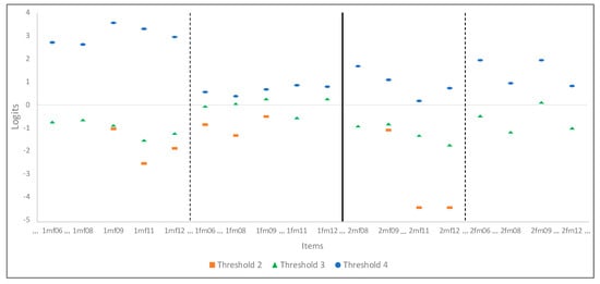 For instance, threshold 3 for item 1mf06 has a difficulty measure of −0.80 (see Figure 6), which means that a person with an ability measure of −0.80 solves this item with a probability of 50% at level 3 or higher. Threshold 4 has a difficulty measure of 2.66, so a person with this ability measure will solve this item with a probability of 50% on level 4, and therefore with the correct answer. For comparison, threshold 3 for item 1fm09 has a difficulty measure of 0.19, indicating that the person with an ability measure of −0.80 has a smaller chance than 50% to solve this item on level 3. The higher the difficulty measure of a threshold, the more difficult it is for a person with a given ability to solve the item on the respective level or above. Therefore, an analysis of the difficulty measures of the thresholds (see Step 4) provides insights into the extent to which the individual CCTCs affect the choice of a particular level of understanding. Please note, that not every threshold exists for every item and sometimes not only the highest or lowest but also a middle level was not included in the answer options. For instance, an item could consist only of answer options on levels 1, 2, and 4, missing level 3, or on 1, 3, and 4, missing level 2. In the first case, values for threshold 2 and 4 and in the latter, values for threshold 3 and 4 were calculated.