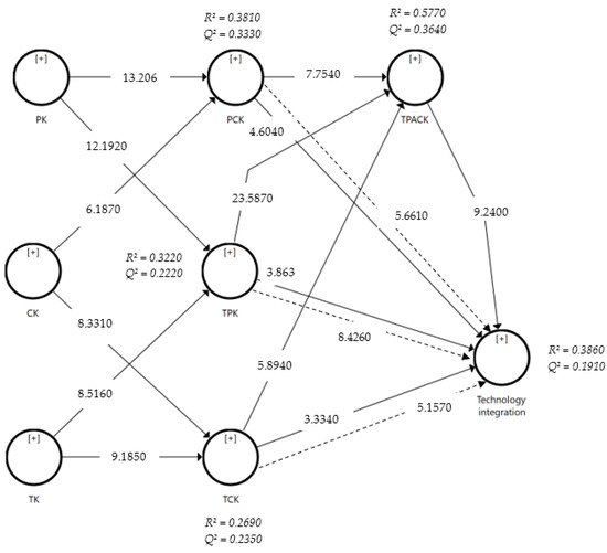 When a particular exogenous variable is removed from the model, the f2 effect size is used to investigate the change in R2 values. According to the PLS-SEM guidelines, an f2 value of 0.02 indicates a small impact, 0.15 indicates a medium impact, and 0.35 indicates a large impact. The effect sizes of the endogenous factors were addressed by all the exogenous factors (Table 5). The largest effect emerged in the relationship between TPK and TPACK (0.4770), while the smallest effect resulted from the relationship between TPK and technology integration (0.0150). The coefficient of determination (R2) is a number that indicates how accurate a prediction is, calculated as the squared correlation between two dependent variables. For the range of 0 to 1, the R2 value is counted. A greater R2 number suggests a better level of predictability. An R2 score of 0.25 is deemed weak, a value of 0.50 is considered moderate, and a value of 0.75 is strong. From the data computation, all the endogenous variables of the model achieved proper levels of predictive accuracy. The R2 value of the TCK was 0.2690 (weak), that of the TPK was 0.3220 (moderate), that of the PCK was 0.3810 (moderate), that of the TPACK was 0.5770 (moderate), and that of technology integration was 0.3860 (moderate) (Figure 3). A Q2 score greater than zero implies that a model’s predictive relevance has been attained. The predictive relevance levels are 0.02 (low), 0.15 (mid), and 0.35 (large) [37,38]. In the SmartPLS, blindfolding computation was used to address the predictive relevance. All the Q2 values were greater than 0, indicating that they were predictive. The Q2 results in Figure 4 support the model’s predictive relevance for all the following endogenous variables: TCK (0.2350, mid), TPK (0.2220, mid), PCK (0.3330, large), TPACK (0.3640, large), and technology integration (0.1910, mid).