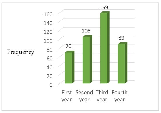 According to the figure, the third-year students had the highest frequency (159) and percentage (37.6%), followed by 105 students in second year (24.8%), 89 in fourth year (21%), and 70 in first year (16.5%).