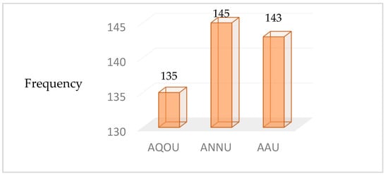 According to Figure 2, 145 respondents—constituting the majority (37.6%)—are from ANNU, followed by 143 AAU students (33.8%) and 135 AQOU students (31.9%).