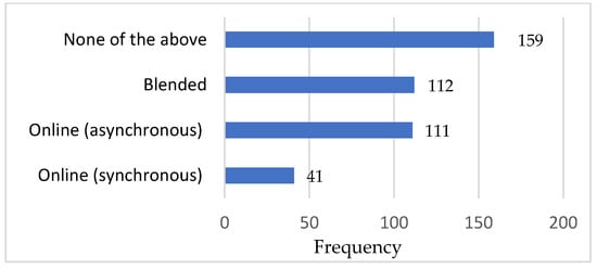 Figure 3 illustrates that majority of the participants (37.6%) did not have a specific online course, while 112 students had blended online courses (26.5%), 111 had asynchronous online courses (26.2%), and 41 had online synchronous (9.7%).