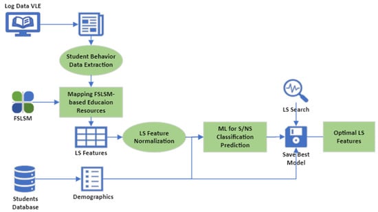 Students’ performance can be significantly improved by adopting an appropriate educational intervention based on their learning styles. In this research study, we propose a framework to detect students’ learning styles based on their behaviors in a virtual learning environment to improve their academic performance. We utilized the Felder–Silverman Learning Style Model, one of the most effective models in online learning in the literature, to map learning resources to learning style features. We defined three states based on course length and employed two main processes, ML Training and LS Selection, to find the individual learning style features that maximize learners’ academic performance in each state. We utilized the Open University Learning Analytics Dataset to test the proposed approach.