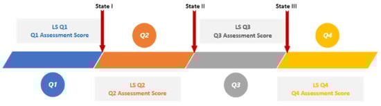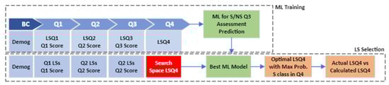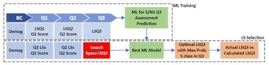 - State III—Beginning of Q4: Find LSs in Q4 to maximize the probability of satisfactory grades in Q4. Figure 5 depicts the modeling process in state III, which includes ML Training and LS Selection steps.