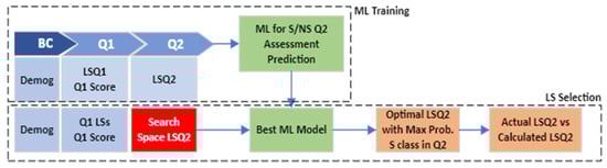 - State I—Beginning of Q2: Find LSs in Q2 that maximize the probability of satisfactory grades in Q2. Figure 3 explains the approach used in State I. It consists of two main processes including ML Training and LS Selection.