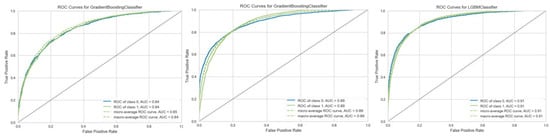 ROC curves for the best models: the left graph shows the ROC for the GB Classifier in state I, the middle graph represents the ROC curve for the GB Classifier in state II, and the right graph shows the ROC curve for the LGBM in state III.