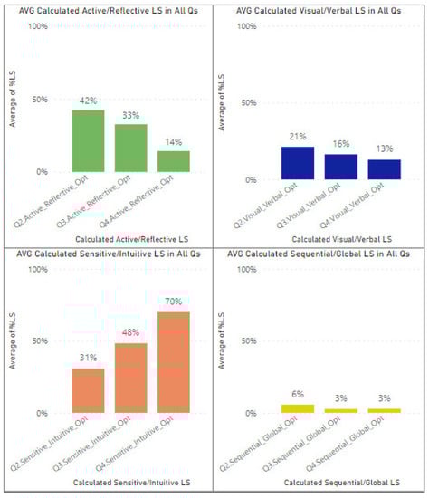Figure 7 depicts the average of all calculated learning style features, including visual/verbal, active/reflective, sensitive/intuitive, and sequential/global, using the proposed modeling approach in Q2, Q3, and Q4. The bar charts represent that in Q2, the processing (active/reflective) learning style feature has the highest average percentage compared with other LSs (42%); however, in Q3 and Q4, the perception (sensitive/intuitive) learning style feature has the most significant values in terms of average percentage (48% and 70%). Moreover, from Q2 to Q4, the average percentage of visual/verbal, active/reflective, and sequential/global learning style features decreased. At the same time, it increased in terms of sensitive/intuitive learning style features.