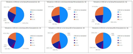 Figure 9 proposes two strategies using calculated learning style features to improve students’ academic performance each quarter. The pie charts in the first row represent how assessment grade classes (S/NS) change when the personalized calculated learning style features are employed, i.e., when the learning resources are personalized based on each learner’s learning styles. According to the top left graph, 22% of students’ grades in Q2 would change from NS to S if the calculated personalized learning style features were utilized. In Q3 and Q4, this percentage decreases to 18%. On the other hand, the percentage of changes from S to NS is only 4% in Q2 and Q3 and decreases to 2% in Q4.