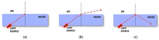 The movement of the light as it propagates from water to air ((a) depicts the figure that should be filled in by students, and (b,c) depict the answers that are consistent with Geometric Optics).