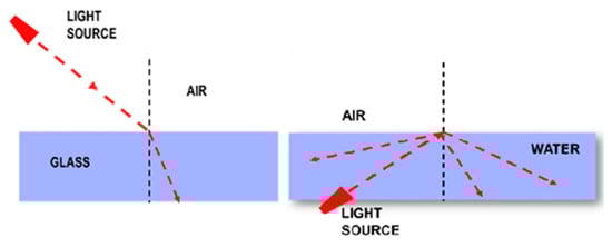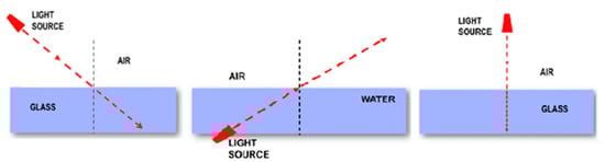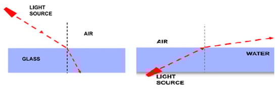 The transformation of scientific models into appropriate school models offers significant advantages in learning, with the ability to formulate stable reasoning being one of the most prominent among them. The syllogisms here are based on three important functions that become powerful tools of thought: description, interpretation and prediction [,]. The Geometric Optics model possesses without deviation these syllogisms and thus constitutes a very suitable framework for teaching and learning. However, there are phenomena that are incorporated into the curriculum of primary and secondary education, such as reflection and refraction, which explanation require the usage of the Wave Optics model, even if their descriptions and predictions can be made with the basic elements of Geometrical Optics. Given the fact that this model is usually introduced at the end of secondary education while reflection and refraction are studied much earlier, it is apparent that specific tools developed within the context of Geometrical Optics are exploited for teaching these phenomena. One of them is Snell’s law, which gives us the capability to measure the deviation of a light ray when passing from one medium into another through establishing a relationship between the path taken by the light ray in crossing the surface of separation between two contacting substances and the index of refraction.