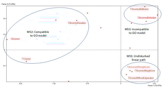 The second factor has an eigenvalue λ2 = 0.4636 and coefficient of inertia τ2 = 11.59% (Table A1, Appendix A). This factor is characterized by the contradiction between two alternative schemata (Table A2, Appendix B): MS1a (‘mental schema of the undisturbed linear path’, one variant of the MS1 mental schema) and MS3b (‘mental schema incompatible with the Geometric Optics model’, one variant of the MS3 mental schema). This is also a very important factor in our analysis, since it shows the contradiction between students who state across all three tasks that the light ray will move in a straight line and those who point out that the light ray will get deflected. Thus, the students’ representations are grouped around two poles.