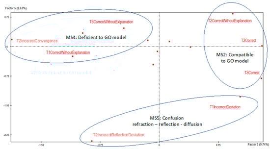 The third factor has an eigenvalue λ3 = 0.3895 and coefficient of inertia τ3 = 9.74% (Table A1, Appendix A). This factor is characterized by the contradiction between two alternative schemata (Table A2, Appendix B): MS2b (‘mental schema compatible with the Geometric Optics model’, one variant of the MS2 mental schema), which have already been found in the first factor, and MS4a (‘mental schema of the deficient approach to the Geometric Optics model’, one variant of the MS4 mental schema). It is a very important factor in our analysis, since it shows the contradiction between: