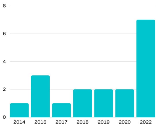 Following the compilation of studies related to the impact of gamification on university students’ learning, a total of 18 potentially relevant articles were obtained in the aforementioned subject area. Most of the research production in the field of study was conducted during 2022, finding that no research was conducted in 2013 or 2020 that met the inclusion and exclusion criteria set out above. These data can be observed in Figure 2, showing the need for more research in this area, as the production during the last decade has been scarce.