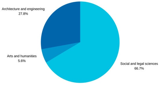 In relation to the branch of knowledge in which gamification strategies are mainly implemented, it can be seen in Figure 4 that the branch of Social and Legal Sciences (66.7%) is the branch of knowledge in which gamified teaching was implemented the most. This branch refers mainly to university degrees related to education, psychology, and economy. In second place is the branch of Engineering and Architecture (27.8%), with engineering and computer science degrees standing out. Finally, gamification experiences are found in the branch of Arts and Humanities (5.6%). This branch is related to the areas of philosophy and philology, among others.