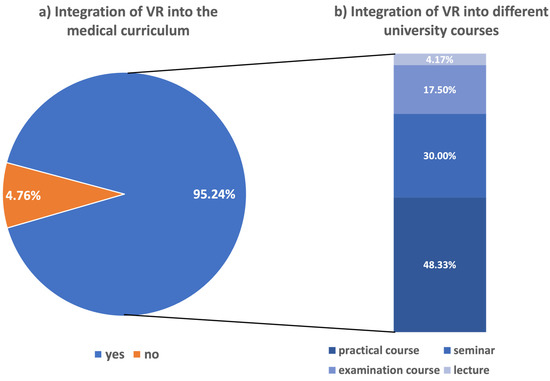 Results: Integration of VR into the medical curriculum (a): n = 252; (b): n = 240, thus representing only participants answering yes (blue) to [SQ6] shown in Figure 2a.
