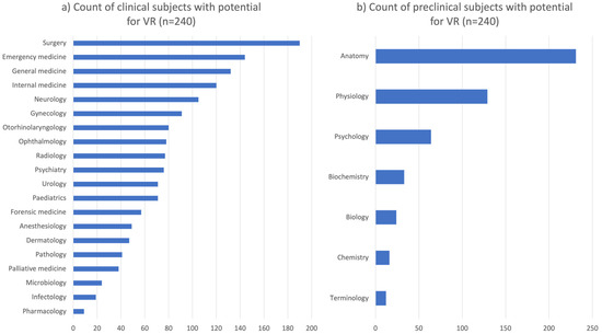 The cohort voting in favor of VR integration (n = 240) selected independently of age groups, on average, six items from the list of 20 clinical specialties (SD = 3.56). In this cohort, a significant relationship was assessed between gender [SQ2] and the following clinical specialties [SQ7]: dermatology (p = 0.04), neurology (p = 0.02), pediatrics (p = 0.011), palliative medicine (0.025), psychiatry (p < 0.001), and forensic medicine (p = 0.027). For all these clinical specialties, females were more likely to vote in favor than their male counterparts, except for forensic medicine, in which the opposite was the case. Surgery received the most votes (n = 190; 79.2%), followed by emergency medicine (n = 144; 60.0%) and general medicine (n = 132; 55.0%) (Figure 3a) without a significant difference between preclinical and clinical students. Final-year students saw the highest potential in surgery, followed by pathology and emergency medicine.