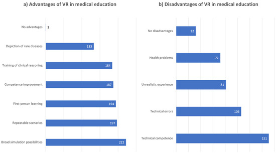 The most voted disadvantages of VR in medical education were technical requirements or competencies (n = 151; 59.9%), followed by technical susceptibility to errors (n = 106; 42.1%) (Figure 4b). This aspect was chosen by almost half of the 18–20-year-olds (n = 31/66; 47.0%) but far less by older groups (31–35 years: n = 2/9, 22.2%; >35 years: n = 0, 0%). Unrealistic scenarios were expected by 81 (32.1%) medical students (35.6% male and 30.3% female) and 72 students (28.6%; male: n = 28, 32.2%; female: n = 44, 26.7%) mentioned health problems, such as dizziness or nausea also known as ‘cybersickness’. Comparing VR-naive with VR-experienced users, a significant difference could be observed. While 40.2% of VR-experienced participants expected health problems, this was only the case among 22.9% of VR-naive students (p = 0.004). Thirty-two participants (12.7%) did not select any disadvantages. Our findings referring to the disadvantages of VR in medical education, according to our cohort’s opinion, are summarized in Table 3.