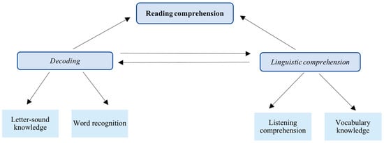 The extent to which L2 learners process audiovisual input with ease, and benefit from their viewing experience, seems to be strongly predicted by L2 proficiency level [31]. At lower proficiency levels, the processing of onscreen text seems to be more effortful, increasing the amount of time viewers spend on captions/subtitles [32,33]. This finding is to be expected considering the complexity of L2 reading and the fact that learners’ ability to read texts with ease and a high level of comprehension appears to be mainly explained by L2-related factors [34,35]. Although the literature has consistently shown evidence of the influence of L1 reading skills on L2 reading [23,26,36,37], it has also been suggested that L2-related factors might be stronger predictors of L2 reading (e.g., [34,35,38,39]). The strong relationship between L2 reading and L2-related factors has been explained in terms of the Simple View of Reading model [40,41] (see Figure 1), which postulates that reading comprehension is mainly explained by word decoding and general oral language comprehension [35].