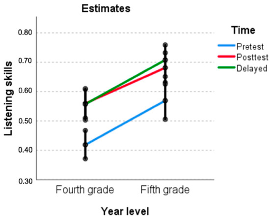 To compare the performance of fourth and fifth graders over time, we calculated a compound symmetry structure GLMM (linear model) with student identification as subjects, and time as a repeated measure. The model was fitted with learners’ scores at the three testing times and the following fixed factors: time, year level, and their interaction. The results yielded significant main effects for year level (F(1,94) = 27.711, p < 0.001) and time (F(2,166)= 72.697, p < 0.001), but not for their interaction. However, the interaction was kept in the model to further observe each year level’s outcomes (see Figure 3 and Table 7).