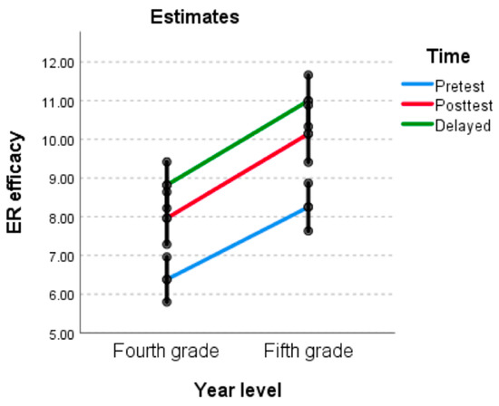 ER efficacy: time pairwise contrasts by group (pretest and posttest).