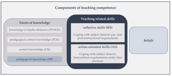 - These dispositions may determine the level of situation-specific skills [2,4]. In this context, PK can be considered as the basis (besides CK) for developing PCK as well as TPACK. Thereby, PK can be seen as the knowledge of processes, practices, and methods of learning and teaching [32,33,34]. According to Koehler and Mishra ([33], p. 64), “this generic form of knowledge applies to understanding how students learn, general classroom management skills, lesson planning, and student assessment.” This goes in line with the assumption by Voss and colleagues ([35], p. 953), who define general PK as “the knowledge needed to create and optimize teaching-learning situations”.