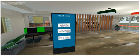 Following the creation of the building, light and terrain, the interaction and ways of movement features were introduced, and a draft implementation was created. During the week four project meeting, as part of the iterative analysis approach [21] adopted for the VR development, the project team made the decision to introduce three NPCs into the environment to enhance the immersion experience. One of these can be seen in Figure 1. Additionally, following testing of the developing VR, the project team raised concerns about first-time users who may have issues with navigation because they were unfamiliar with such technology. To address this, the project team decided a help section located where the student enters would be created in the VR. The help section included a demonstration video of VR usage. Figure 3 is a screenshot via the user (student) interactive VR environment, which shows the help section.